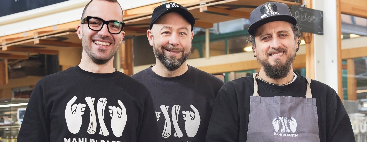 Das Projekt Mani in Pasta - handgemachte Pasta - entstand durch das Zusammentreffen zwischen zwei Küchenchefs und einem Toningenieur. Mani in Pasta möchte ein einheimisches Produkt präsentieren, mit Liebe und Sorgfalt hergestellt, um so die typischen Geschmäcker der mediterranen Küche zu Tisch zu bringen. Mittlerweile gibt es auch leckere Pastasaucen für Zuhause. Die frische Pasta wird in 12 verschiedene Sorten hergestellt und ist rein italienisch und jede einzelne Zutat 100% ökologisch: Molino Agostino liefert das exquisite 100% Hartweizen- und Dinkelmehl, die Eier werden von den besten norditalienischen Hühnern gelegt und das Gemüse für die Pastagerichte kommen natürlich aus Süditalien. Die frische handgemachte Pasta direkt vom Stand in der Markthalle oder Zuhause versüßt jede Mittagspause!